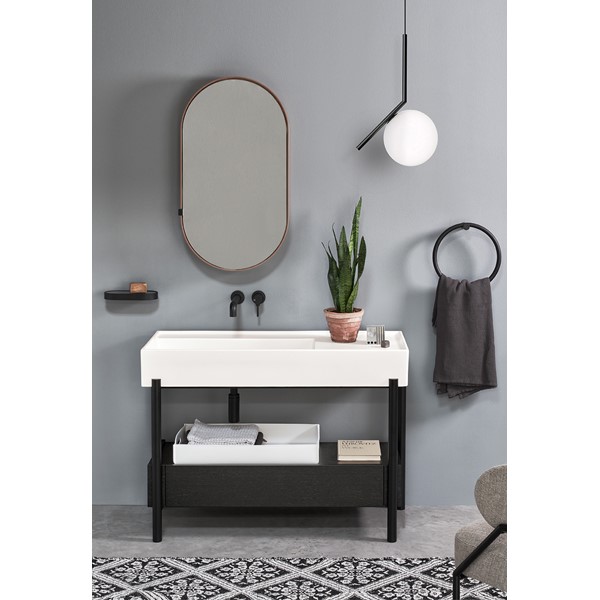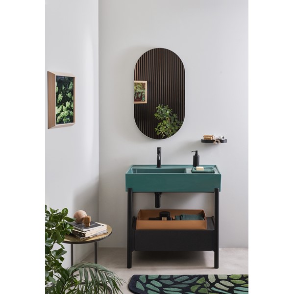 Διατίθεται σε μια πλούσια ματ παλέτα χρωμάτων ή απλά σε λευκό.Ο μεγάλος νιπτήρας με πρακτικό πάγκο, που προσφέρεται σε εξαιρετικά μεγάλο μέγεθος 140x46x16 cm στις 16 αποκλειστικές αποχρώσεις της παλέτας χρωμάτων Terre di Cielo, τοποθετείται σε μια εκλεπτυσμένη εξαιρετικά λεπτή βάση, με ελαφρύ και ταυτόχρονα αυστηρό σχεδιασμό, από μέταλλο - σε φινιρίσματα Nero Matt, Talco ή Cemento - και σε πολύτιμα συμπαγή ξύλα, όπως Rovere Naturale, Rovere Grigio, Rovere Sbiancato , Παραλλαγές Rovere Nero.