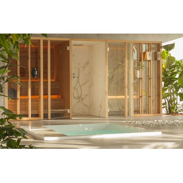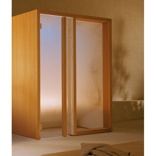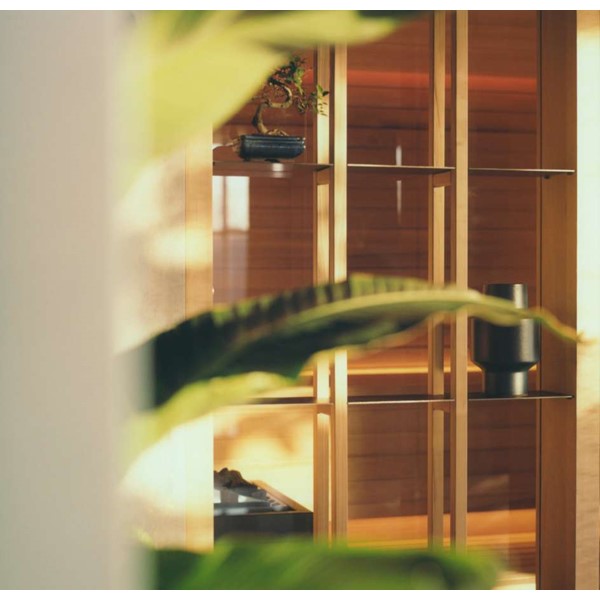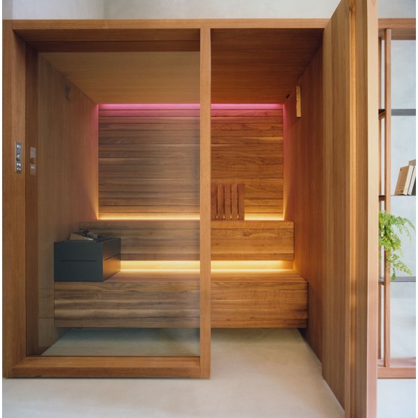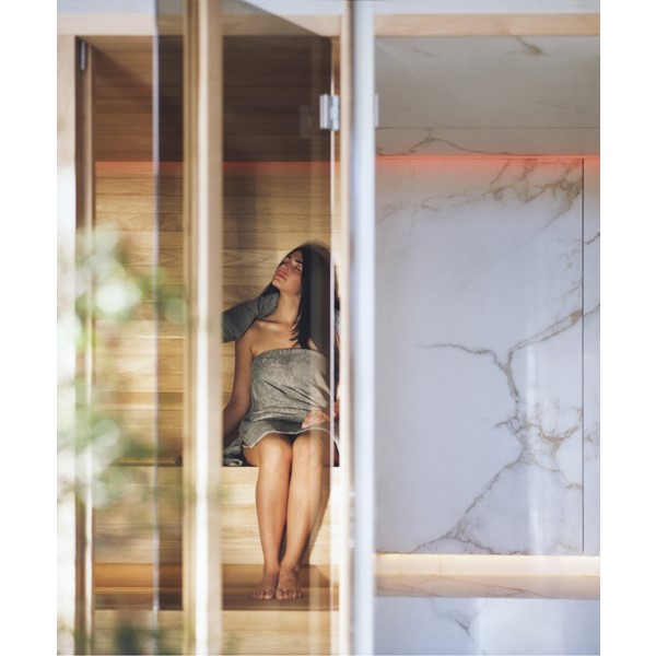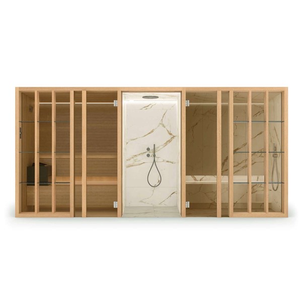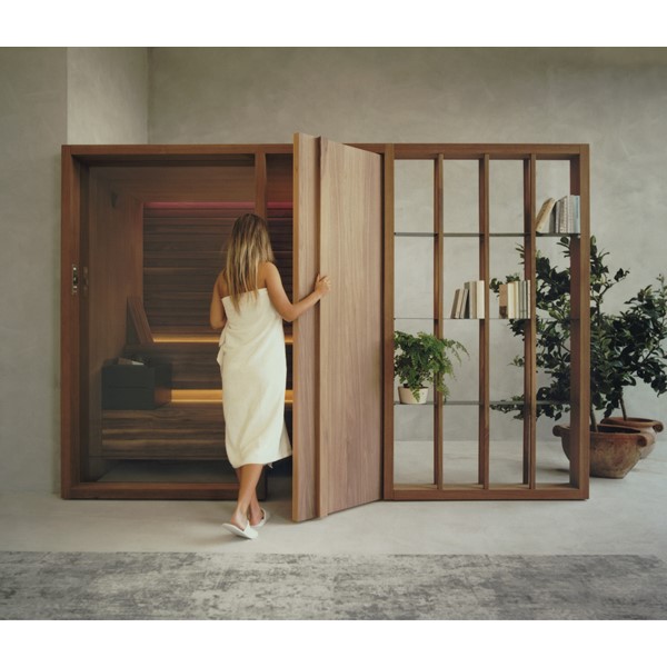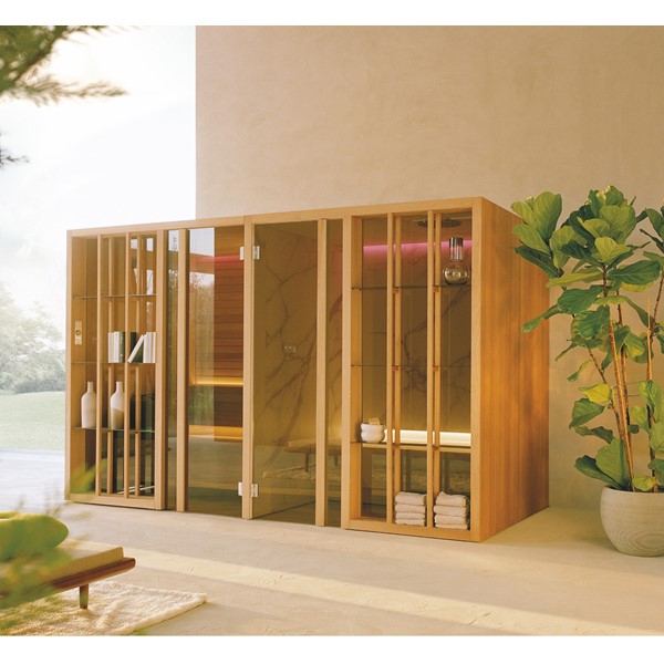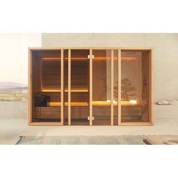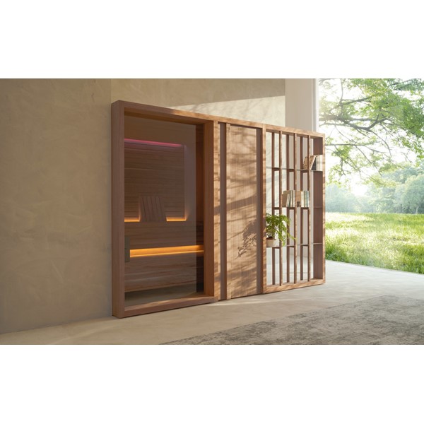 YOKU’s essential, well-balanced minimalist design is also warm, welcoming and natural. The heater is built into the lowest bench thus displaying an uncluttered, linear effect. The large glass panel at the front features vertical elements in natural wood on the outside, which make the space inside more private and provide shelving that is open to the external environment.