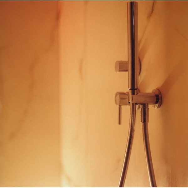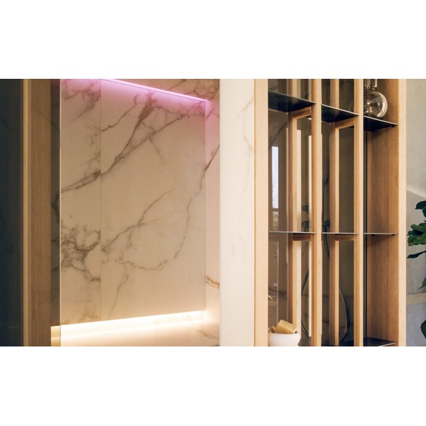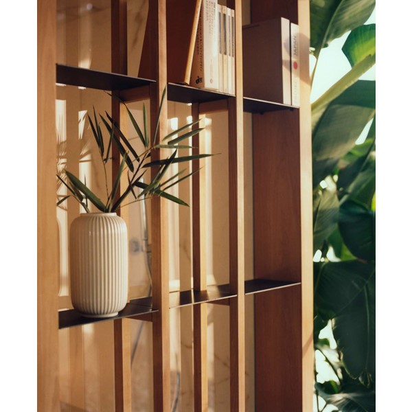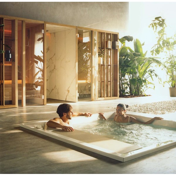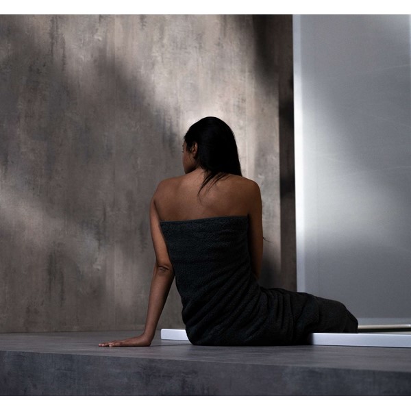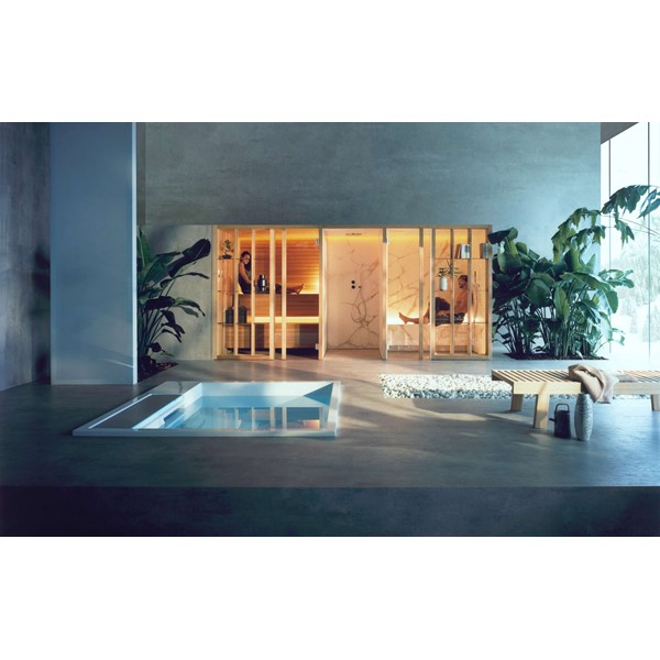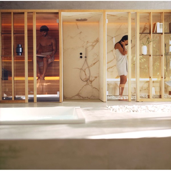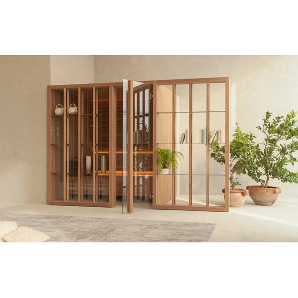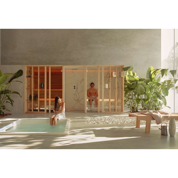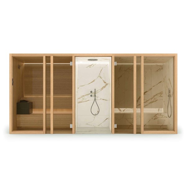 YOKU’s essential, well-balanced minimalist design is also warm, welcoming and natural. The heater is built into the lowest bench thus displaying an uncluttered, linear effect. The large glass panel at the front features vertical elements in natural wood on the outside, which make the space inside more private and provide shelving that is open to the external environment.