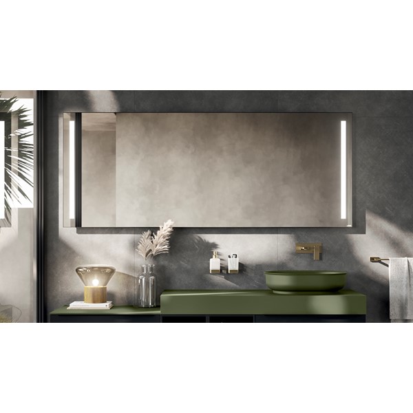 Mirror with painted aluminium frame. Glass thickness 4 mm. With upper/lower frontal and room light. Light color adjustment 2700-6000k. Optional: a steam free heated pad and Bluetooth connection.
