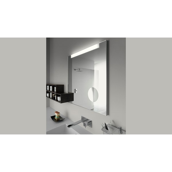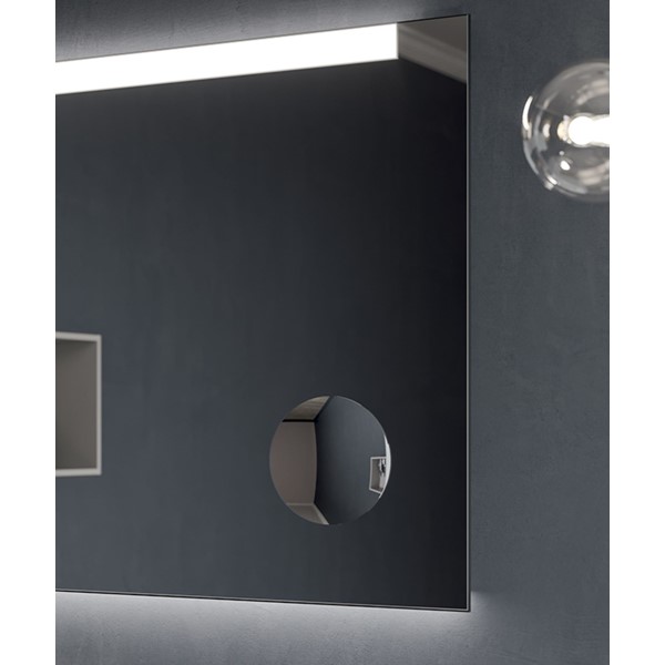 Mirror with painted aluminium frame. Glass thickness 4 mm. With frontal and under-mirror light. With integrated magnifying mirror. Light color adjustment 2700-6000k. Optional: a steam free heated pad, Bluetooth connection and USB port to charge your devices.