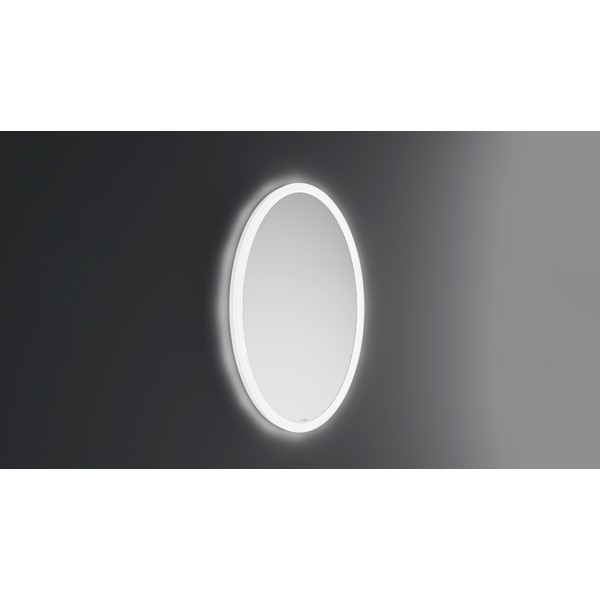 Mirror with frame and satinated glass edge which diffuses the light. 4-mm glassthickness. Adjustable scattered room light. Buttons on keyboard. Optional: a steam free heated pad and Bluetooth connection.