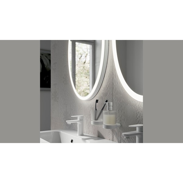 Mirror with frame and satinated glass edge which diffuses the light. 4-mm glassthickness. Adjustable scattered room light. Buttons on keyboard. Optional: a steam free heated pad and Bluetooth connection.