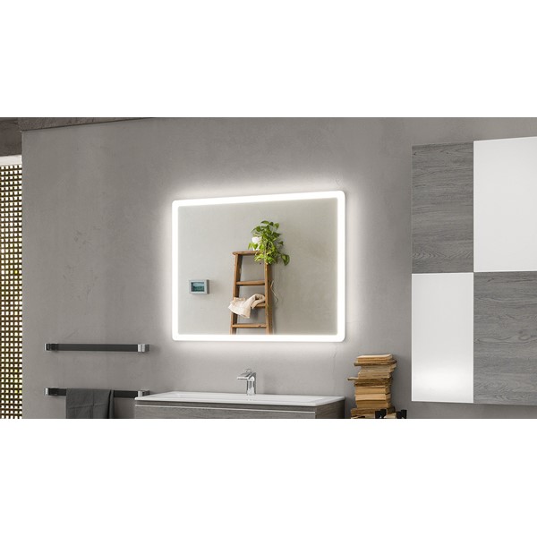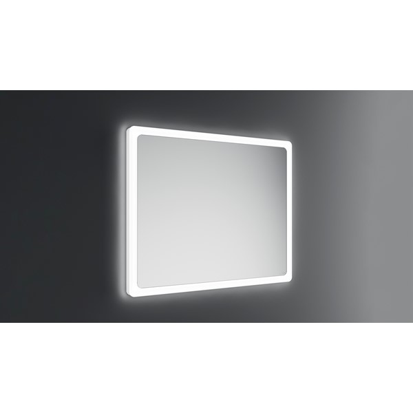 Mirror with frame and satinated glass edge which diffuses the light. 4-mm glassthickness. Adjustable scattered room light. Buttons on keyboard. Optional: a steam free heated pad and Bluetooth connection.