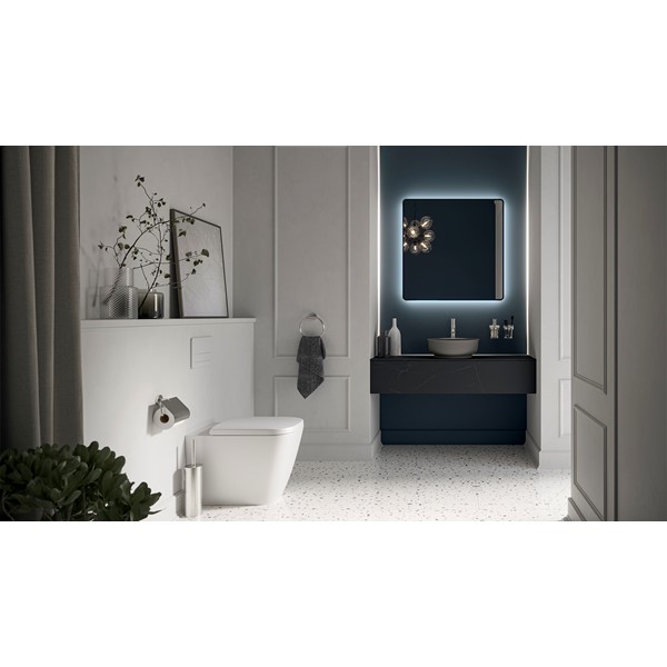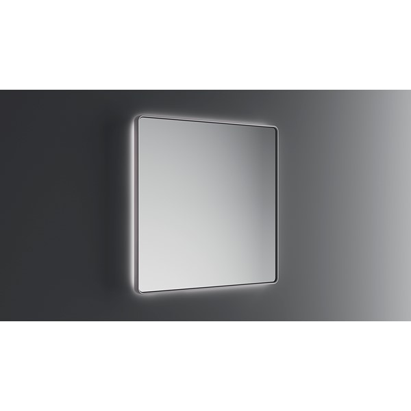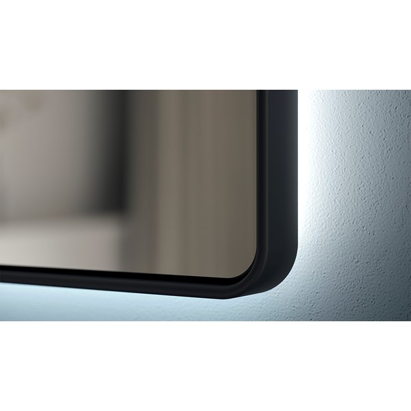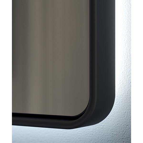 Mirror with resin frame. 4-mm glass thickness. Rear room light. Wall buttons. Optional: a steam free heated pad.