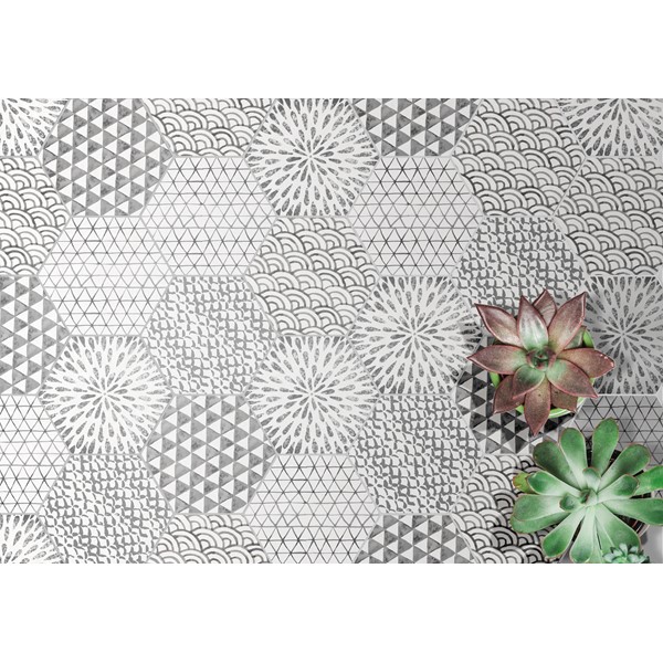 Σε αυτή τη συλλογή, η Quintessenza προτείνει το κλασσικό σχήμα εξάγωνου (17x15 cm), σε χρώματα ποπ αρτ και έντονα γεωμετρικά μοτίβα, ιδανικά για συνδυασμό σε μια απέραντη ποικιλία διακοσμητικών επενδύσεων.