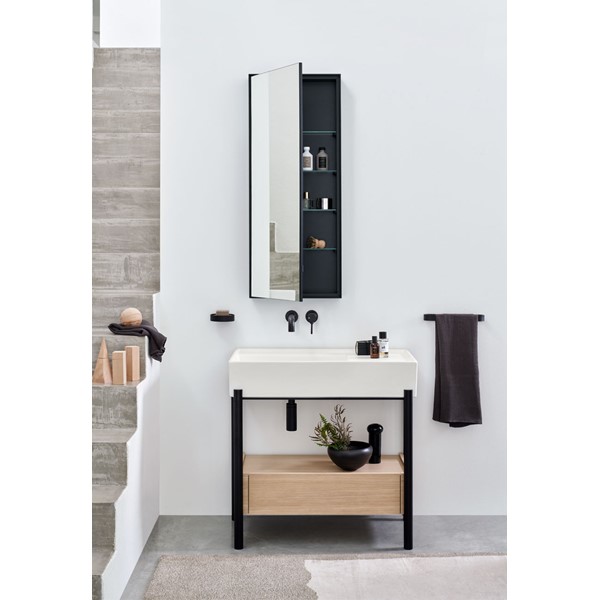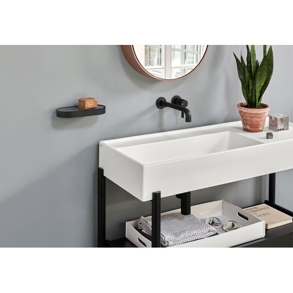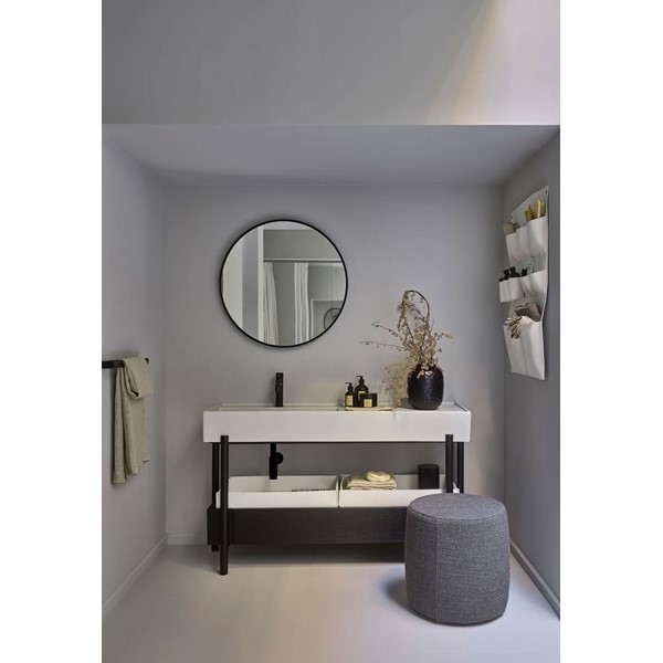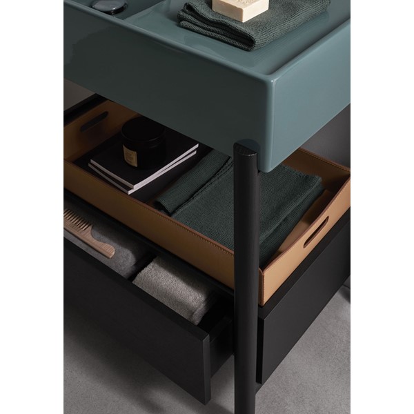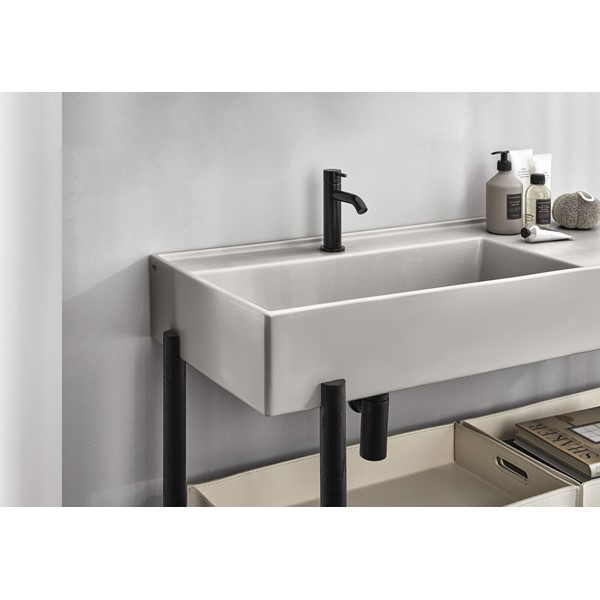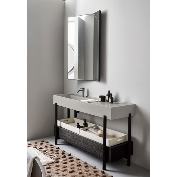 Διατίθεται σε μια πλούσια ματ παλέτα χρωμάτων ή απλά σε λευκό.Ο μεγάλος νιπτήρας με πρακτικό πάγκο, που προσφέρεται σε εξαιρετικά μεγάλο μέγεθος 140x46x16 cm στις 16 αποκλειστικές αποχρώσεις της παλέτας χρωμάτων Terre di Cielo, τοποθετείται σε μια εκλεπτυσμένη εξαιρετικά λεπτή βάση, με ελαφρύ και ταυτόχρονα αυστηρό σχεδιασμό, από μέταλλο - σε φινιρίσματα Nero Matt, Talco ή Cemento - και σε πολύτιμα συμπαγή ξύλα, όπως Rovere Naturale, Rovere Grigio, Rovere Sbiancato , Παραλλαγές Rovere Nero.