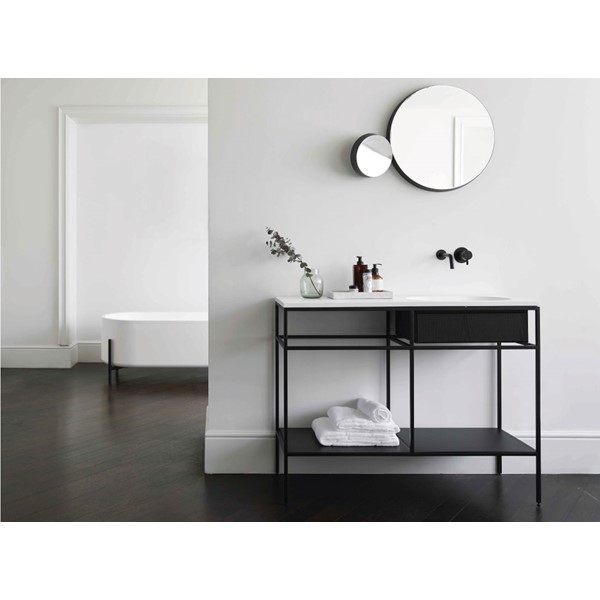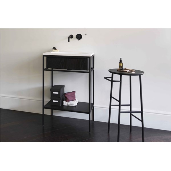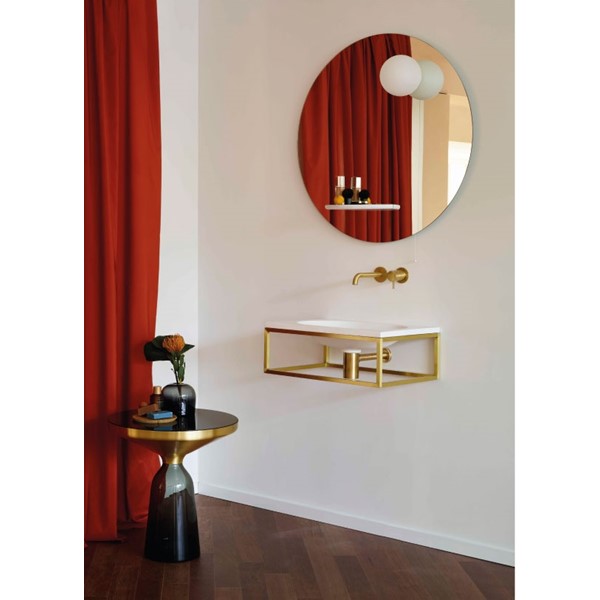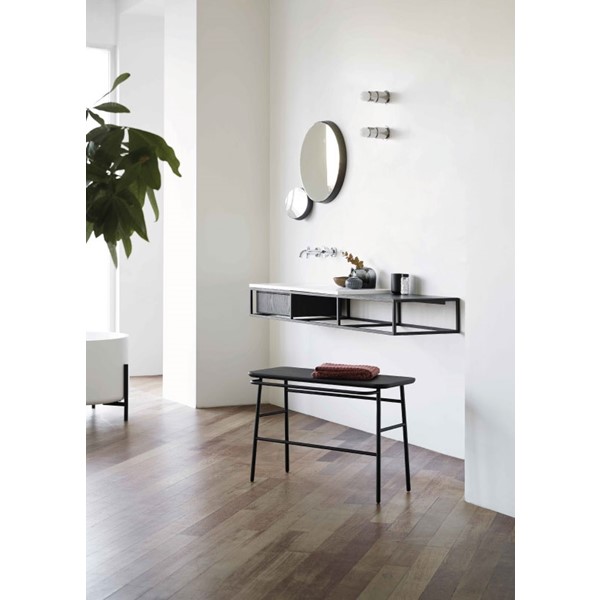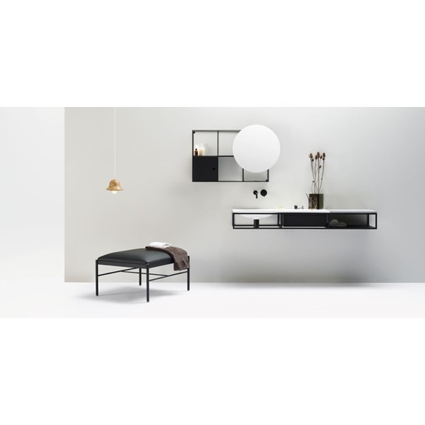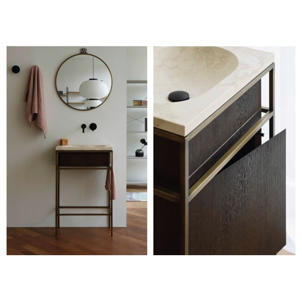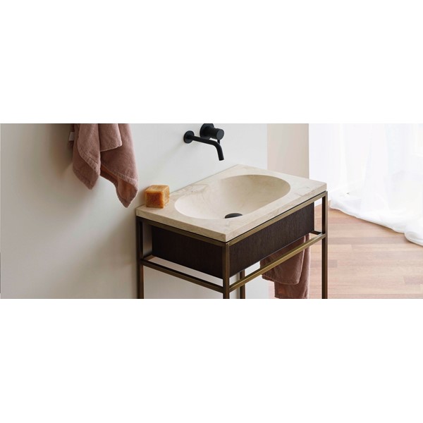 Η κύρια χαλύβδινη κατασκευή έχει σχεδιαστεί για να φιλοξενεί τη λεκάνη καθώς και έναν πάγκο σε διάφορα υλικά όπως το ξύλο, το LivingTec®, το μάρμαρο και η πέτρα, ενώ το εσωτερικό σας επιτρέπει να κρεμάσετε ένα ξύλινο ντουλάπι ή ένα συρτάρι για αποθήκευση.