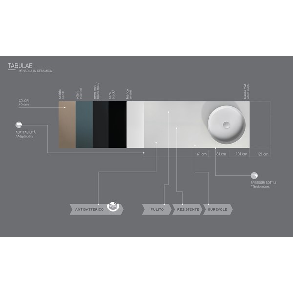 Η Galassia δημιουργεί με την Tabulae την πρώτη συλλογή κεραμικών ράφια με λεπτές άκρες (πάχους μόλις 5mm), διαθέσιμη σε διάφορα μεγέθη και χρώματα, σε συνδυασμό με έπιπλα και δομές διαφορετικών φινιρισμάτων και διαστάσεων. Μέγιστη ευελιξία και προσαρμογή του μπάνιου με ένα λειτουργικό και κομψό σύστημα κατάλληλο για κάθε τύπο χώρου και γευσιγνωσίας.