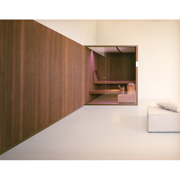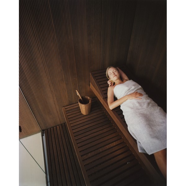 Σάουνα από ξύλινο φινίρισμα διαθέσιμη σε Canadian Hemlock και θερμικά επεξεργασμένο σκληρό ξύλο, διαθέσιμη επίσης με επιφάνεια σε καθρέφτη κατόπιν ζήτησης.