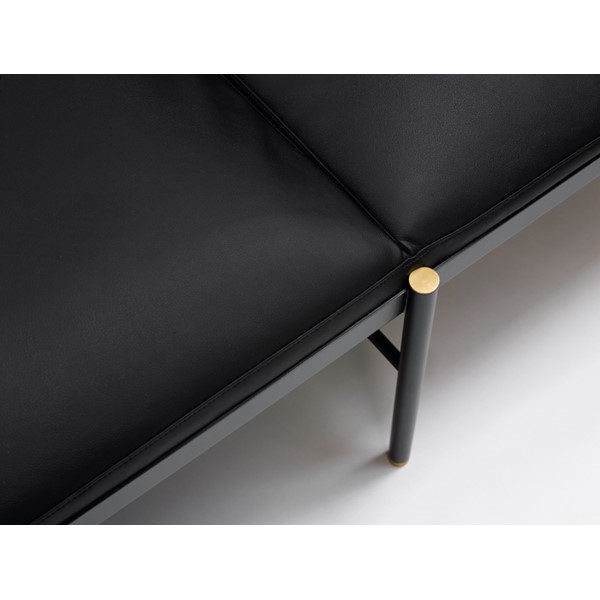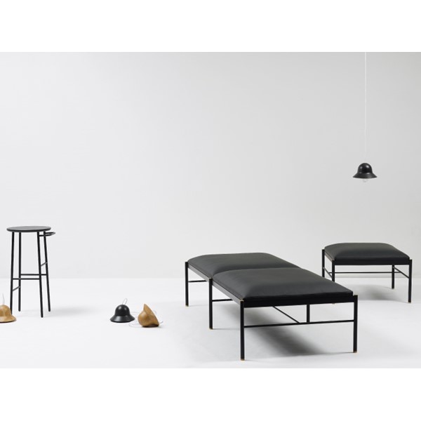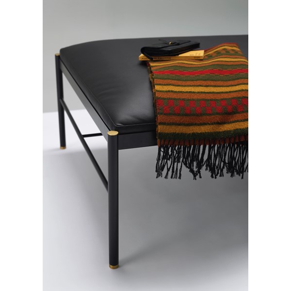 The rest line is inspired by poufs, daybeds and chairs that are used in fitting rooms and wardrobes, and is designed in order to create something that can be used in the bathroom and beyond. A traditional and elegant six legged daybed structure together with the pouf are both inspired by the Bauhaus aesthetic. Pushing a new concept of comfortable seating, they feature a structure of metal tubes refined with small brass details and eco-leather cushions.