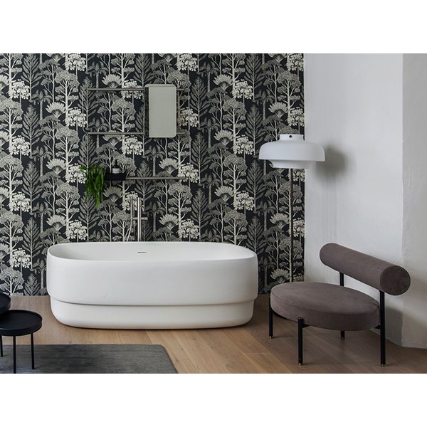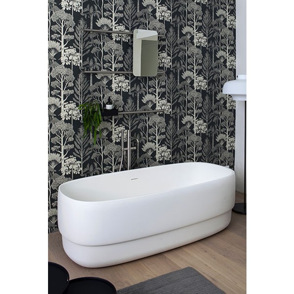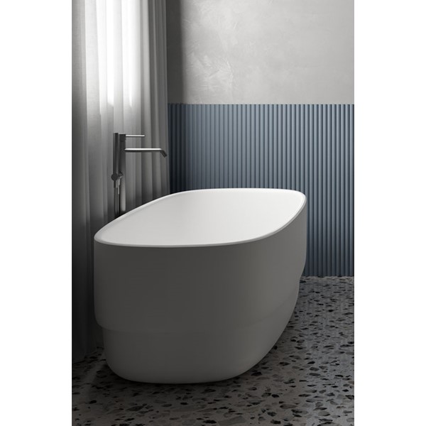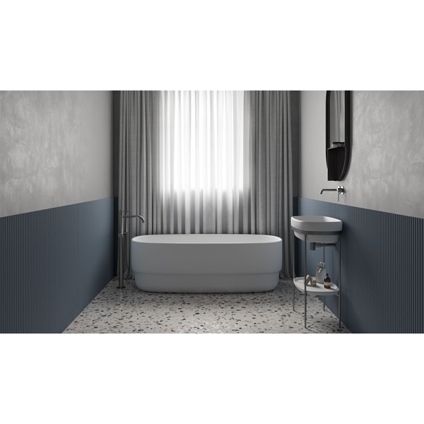 The concept is developed starting from the satin steel band put under the washbasin which combines support functionality and aesthetic along with giving brightness and refinement to the product. From here the featured materials, Livingtec solid surface and steel, merge together creating a contemporary product with a strong personality.