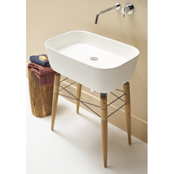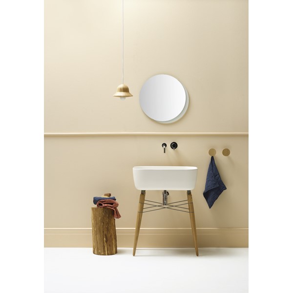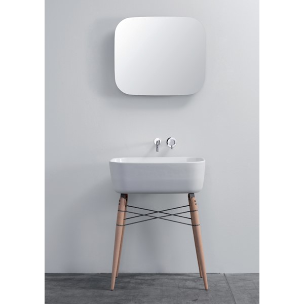 Ray combines a simple archetypical ceramic basin with a light furniture-like support structure. The varnished steel wires which brace the wooden legs can also be used as towel rails. The shape of the basin and the colour of the steel wires match perfectly with Ray Mirror.