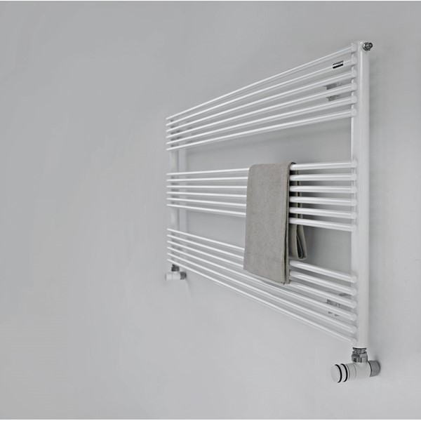 These towel warmers have a horizontal configuration with alternated groups of elements, which highlights the functional and aesthetic features.