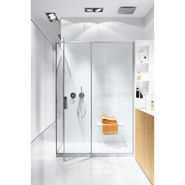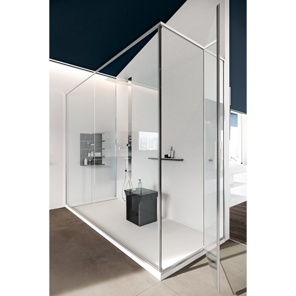Linea is a made-to-measure shower enclosure with swing door 50 or 60 cm. It is characterized by its slender linear hinge, light satined aluminum profiles and tempered transparent glasses 10 mm thick. It is available in all typologies – corner, niche, wall – up to 210×110 cm with standard height 195 cm.