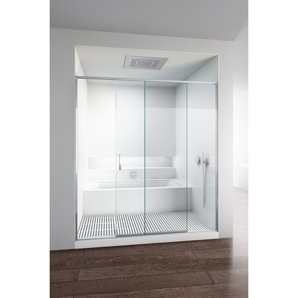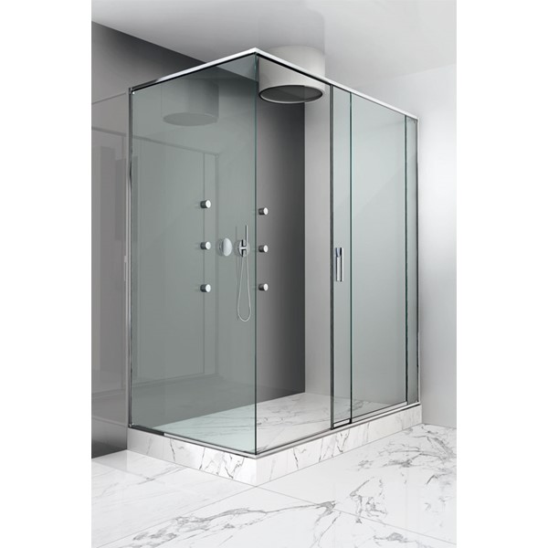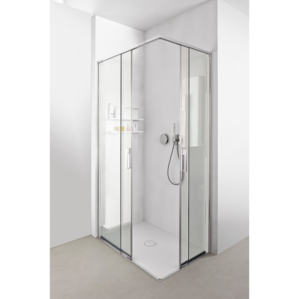Slide is a made-to-measure shower enclosure with sliding door, available also with double door in big sizes. It is characterized by light polished aluminum profiles and tempered transparent glasses 8 mm thick. It is available in all typologies – corner, niche, wall – up to 210×110 cm with standard height 195 cm (on request up to height 210 cm – maximum size).