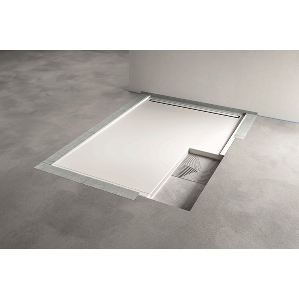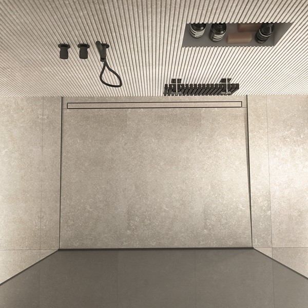 Unico is an unclad shower tray with linear waste in stainless steel.