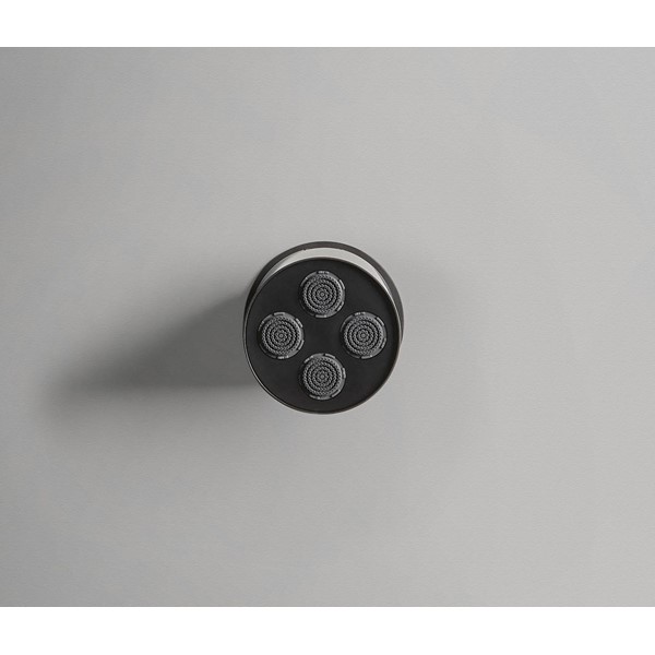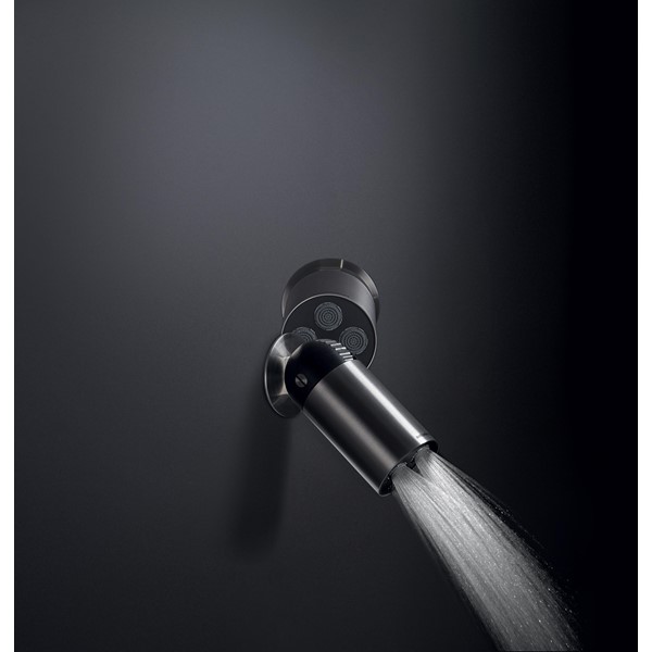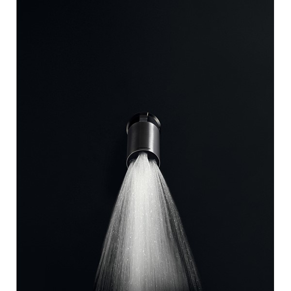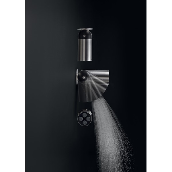 A perfect cylinder, compact, essential, precise, an image that is the perfect synthesis of technology and design: AZIMUT is the ceiling and wall shower-head in stainless steel and black Derlin with a special rotation which is the heart of the project.