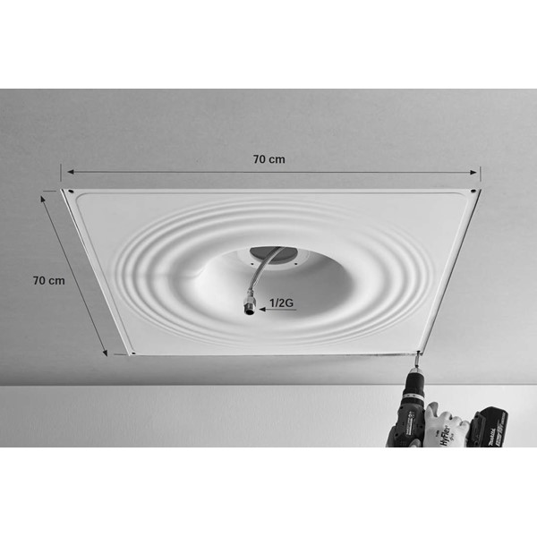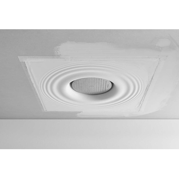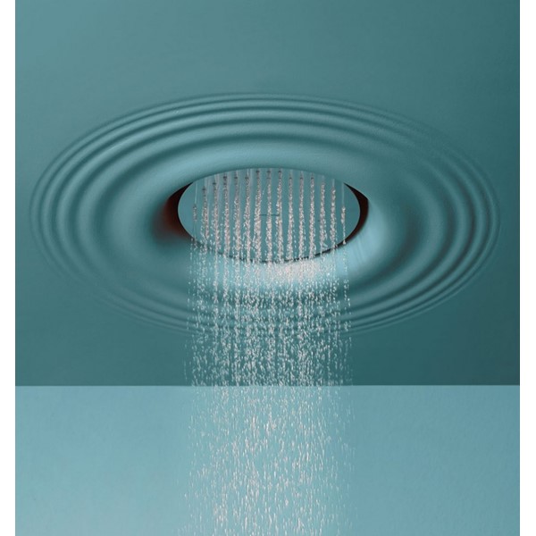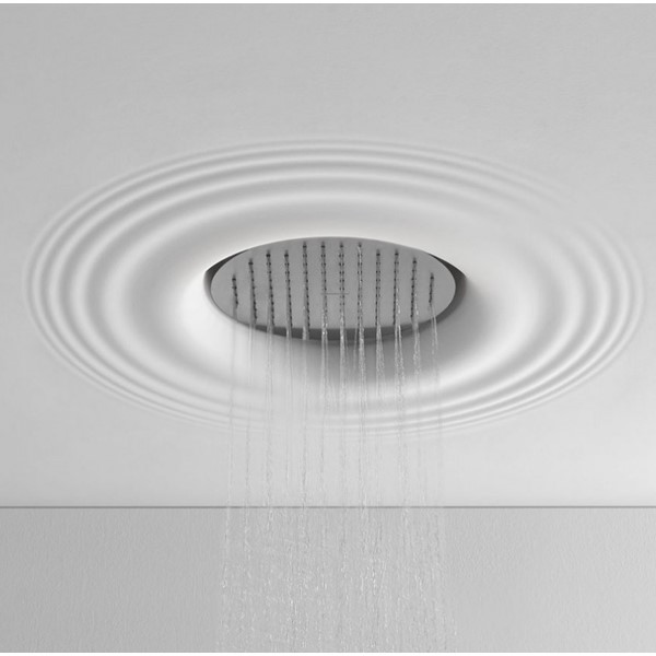 The elegance of an indication that refers to one of the most well-known phenomena of nature, the technological excellence that allows us to perfectly reproduce the image, the creative thought of the man who takes the essence and proposes it in a new alienating way, overturning the perception. Raindrop is all this, it is a showerhead integrated in the ceiling that reproduces the image of the effect generated by a drop of rain that hits the surface of the water. The delicate concentric circles that evolve with less intensity while moving away from the center, portray a sophisticated sign on the ceiling, a natural decoration that wraps and protects the built-in showerhead.