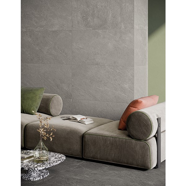 The collection comes from the mixing of classic split slates, with their clear grains and soft shading, and sedimentary stones with a fine-grained base and stronger colours. The fusion of these two natures generates a new aesthetic reference that doesn’t exist in nature.