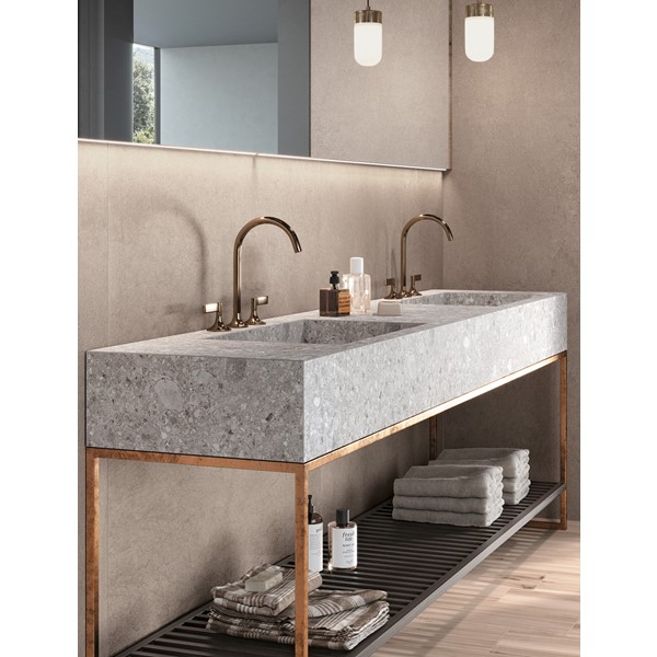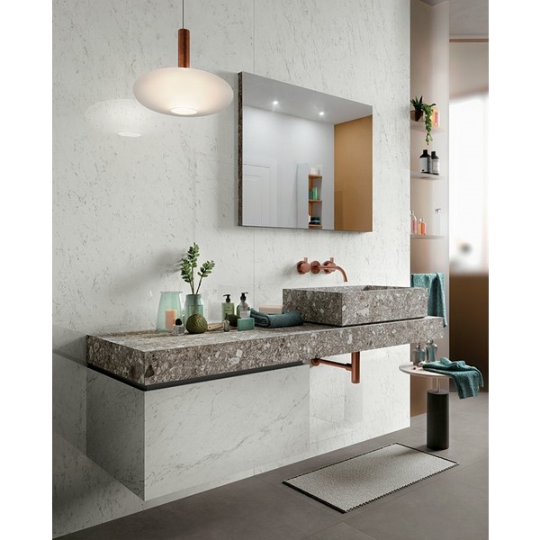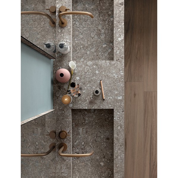 A material with a distinctive harmoniously random texture, with pebbles of different colors and size and shade-on-shade hues with a 3D effect.