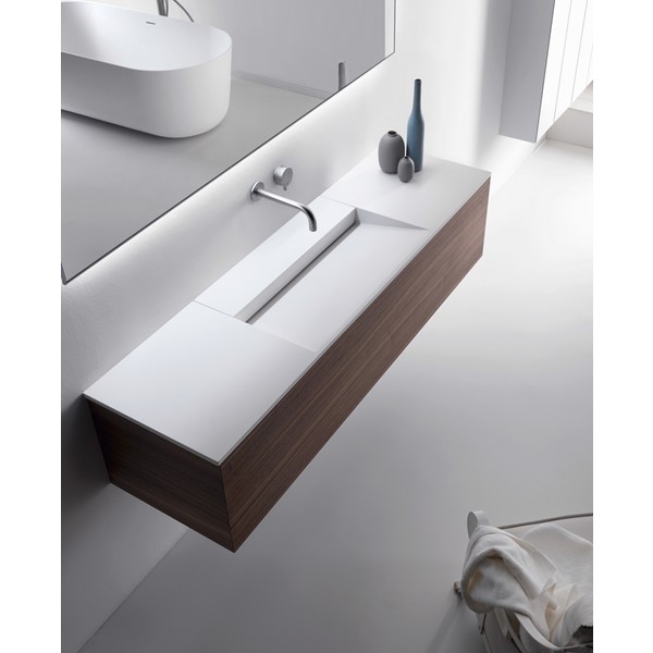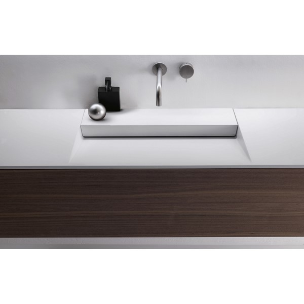 Integrated countertops with distinctive, uniquely designed washbasins in Cristalplant Biobased, with endless customisable possibilities in terms of size and thickness, in addition to the position of the washbasin on the countertop. Cristalplant Biobased is the highest performing material in the world used for making washbasins and bathtubs. It has a tactile and uniquely soft and even light-reflecting effect.