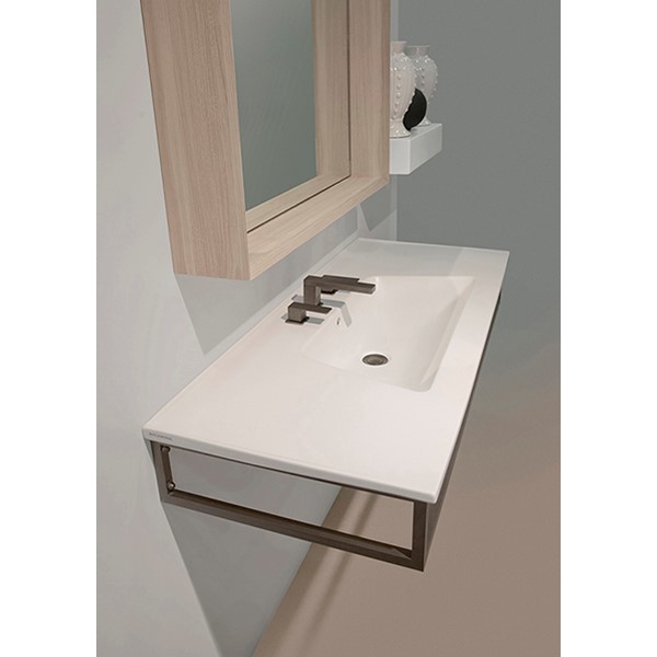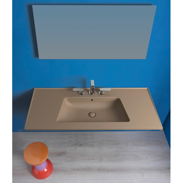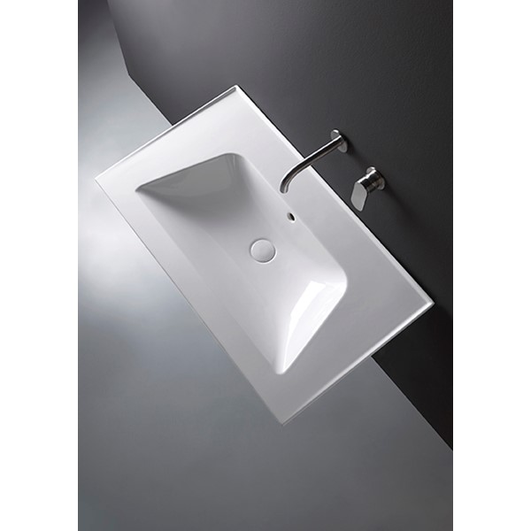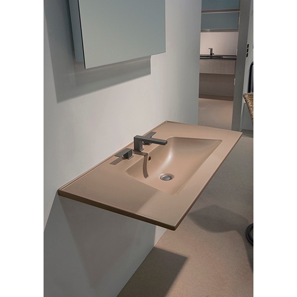 Bloom is a stylish countertop washbasin, available in four sizes. The generous geometric proportions and the very thin profile of the top create a pleasing and refined contrast with the soft, round shape of the basin.