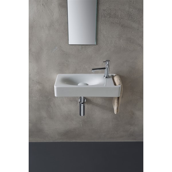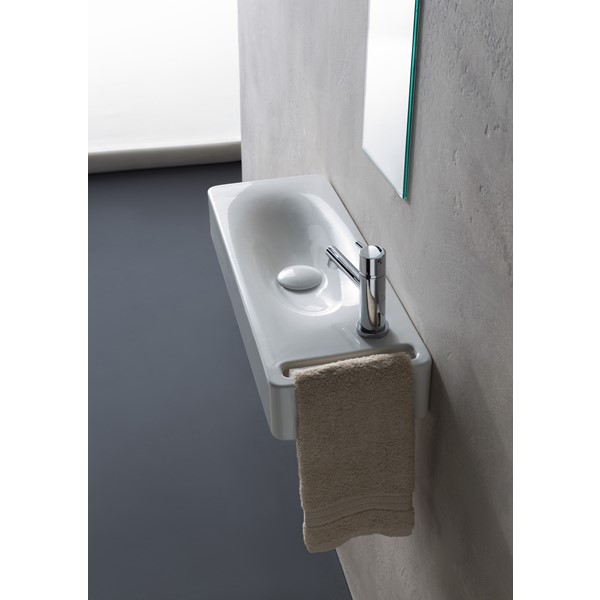 Hung is the ideal and functional solution for optimizing space. Designed by Emo design, this rectangular mini ceramic washbasin also incorporates a towel rail hole in its main structure,ensuring everything is within easy reach in an extremely small space.
