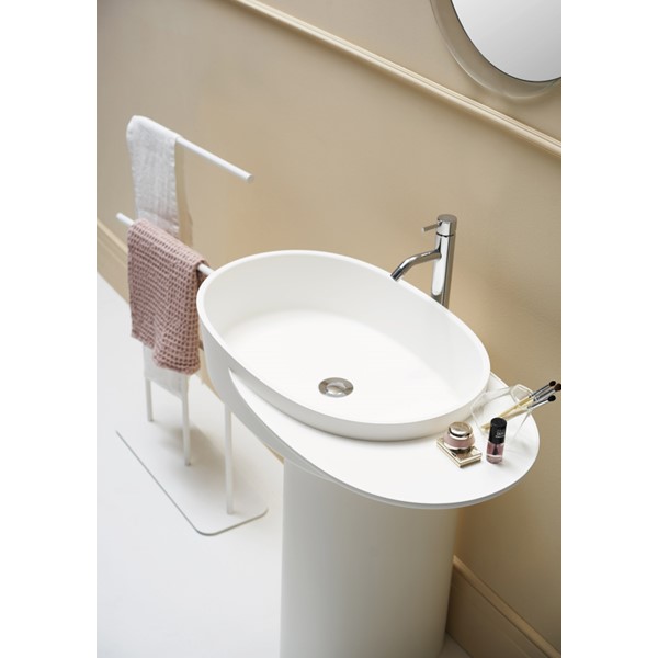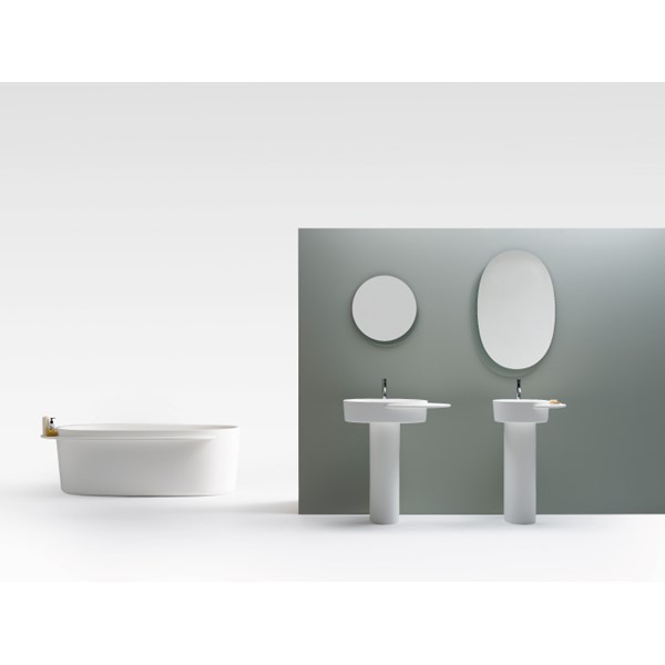 Plateau, the first bathroom collection for German designer Sebastian Herkner. Washbasin that reintroduces the functionality and aesthetic. Can be crafted with the tray on the left or on the right side as well as on a upper or lower positions or without a tray, to meet any need and preference. Available with a freestanding column or as a counter top basin.