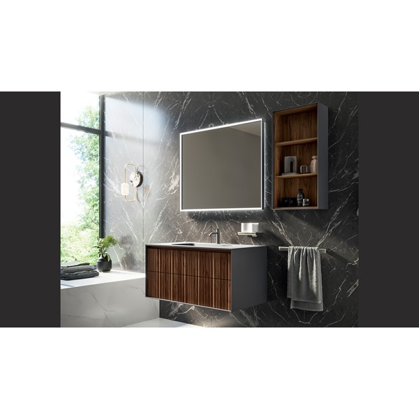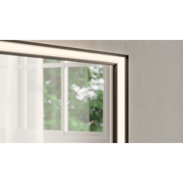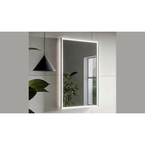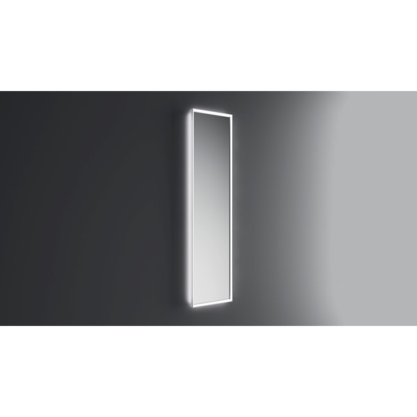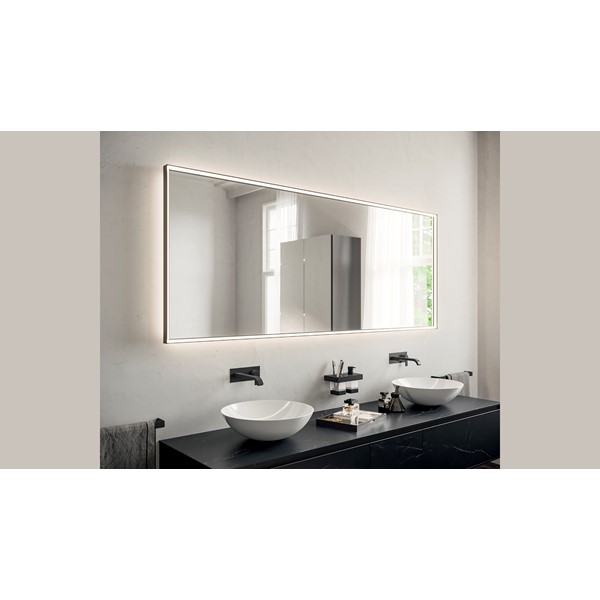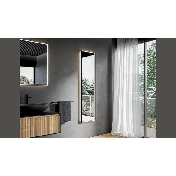 Mirror with painted aluminium frame. 4-mm glass thickness. With room light and frontal light, integrated to the frame. Light color adjustment 2700-6000k. Optional: a steam free heated pad, Bluetooth connection and USB port to charge your devices.