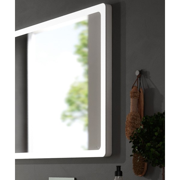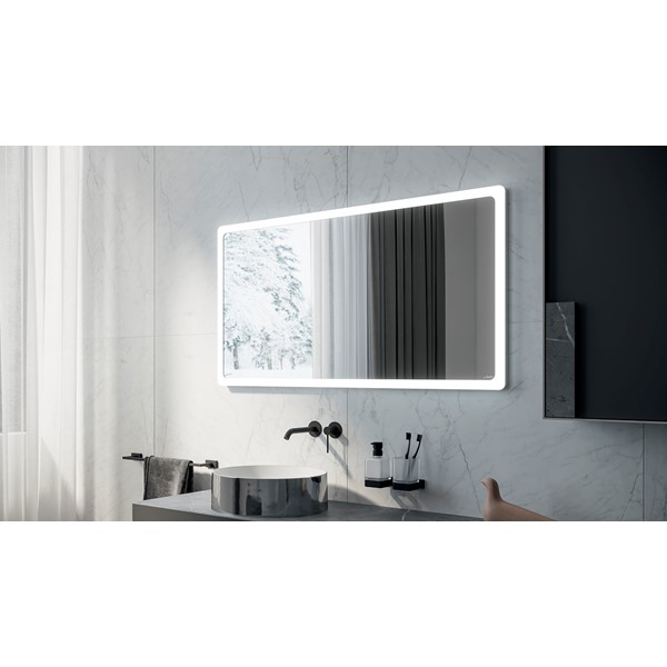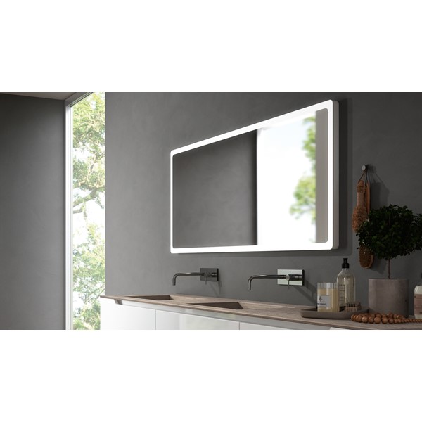 Mirror with frame and satinated glass edge which diffuses the light. 4-mm glassthickness. Adjustable scattered room light. Buttons on keyboard. Optional: a steam free heated pad and Bluetooth connection.